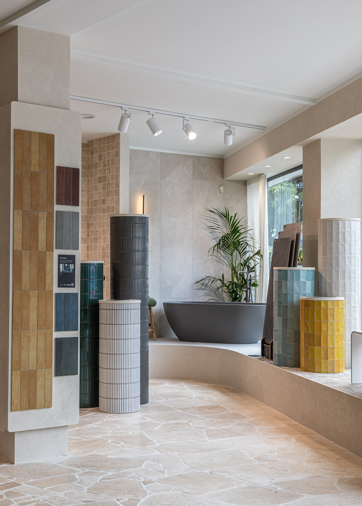 Plumbline pieces are integrated throughout, helping to demonstrate how surfaces interact with form, colour and function. Tile applications extend beyond expected areas, offering new ways to think about how materials can be used across a project.
