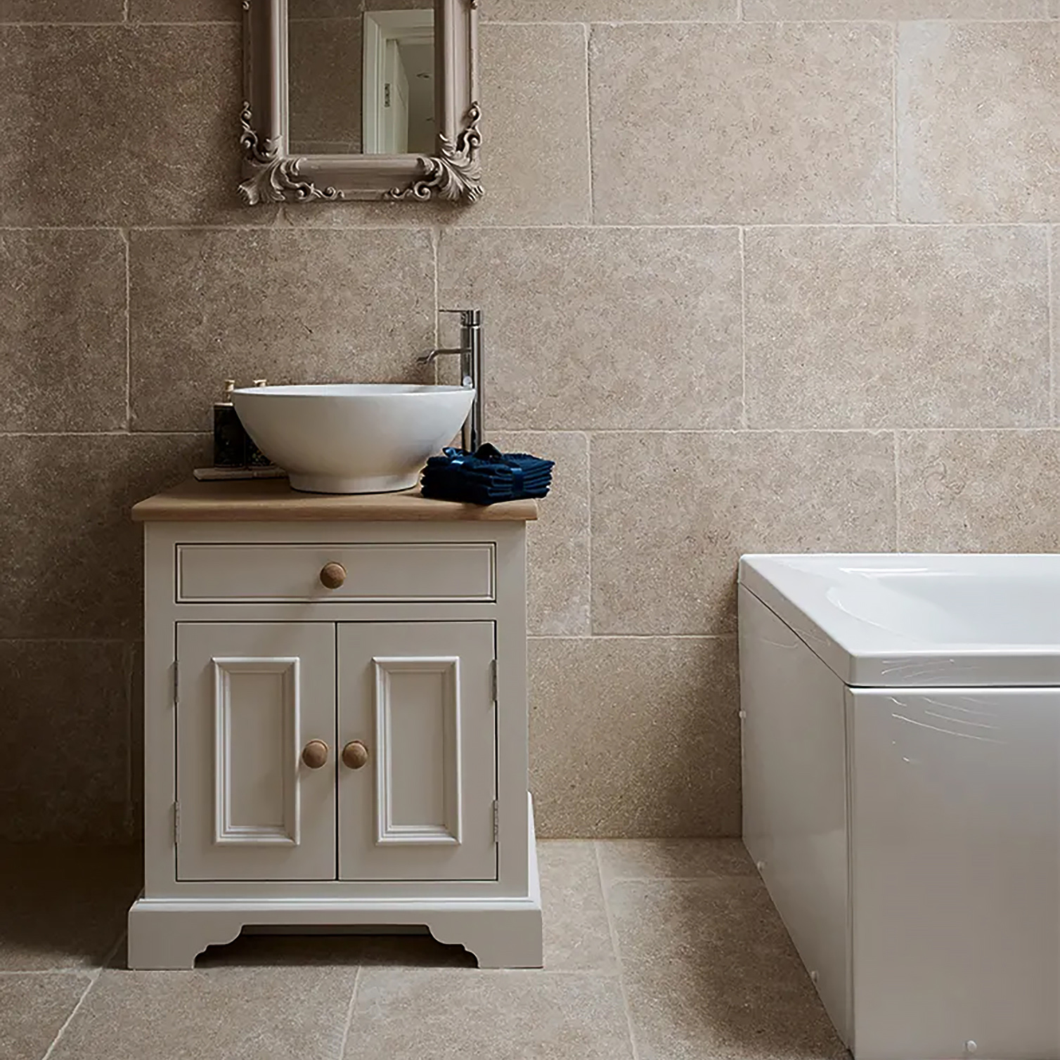 Biscoff Tumbled is a warm beige Limestone with a softly tumbled surface and edges. The lightly worn, old-world style and brings a sense of charm and allure to any floor or space. Mainly used throughout interiors, but some formats can offer a more textural element in exterior spaces such as the crazy paving or batons.