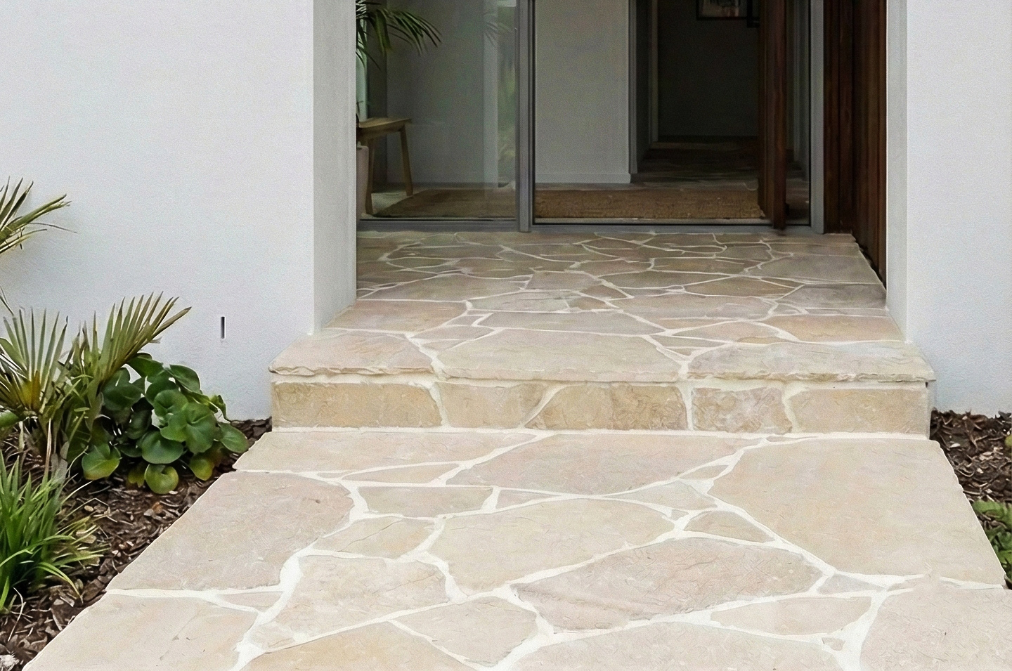 Biscoff Arendo's surface provides for a beautiful, textural element with this warm beige Limestone. Through several processes, this unique surface is created to bring a softly structured finish which is soft underfoot, whilst retaining an anti-slip element for exterior applications such as patios, paths and pool surrounds.