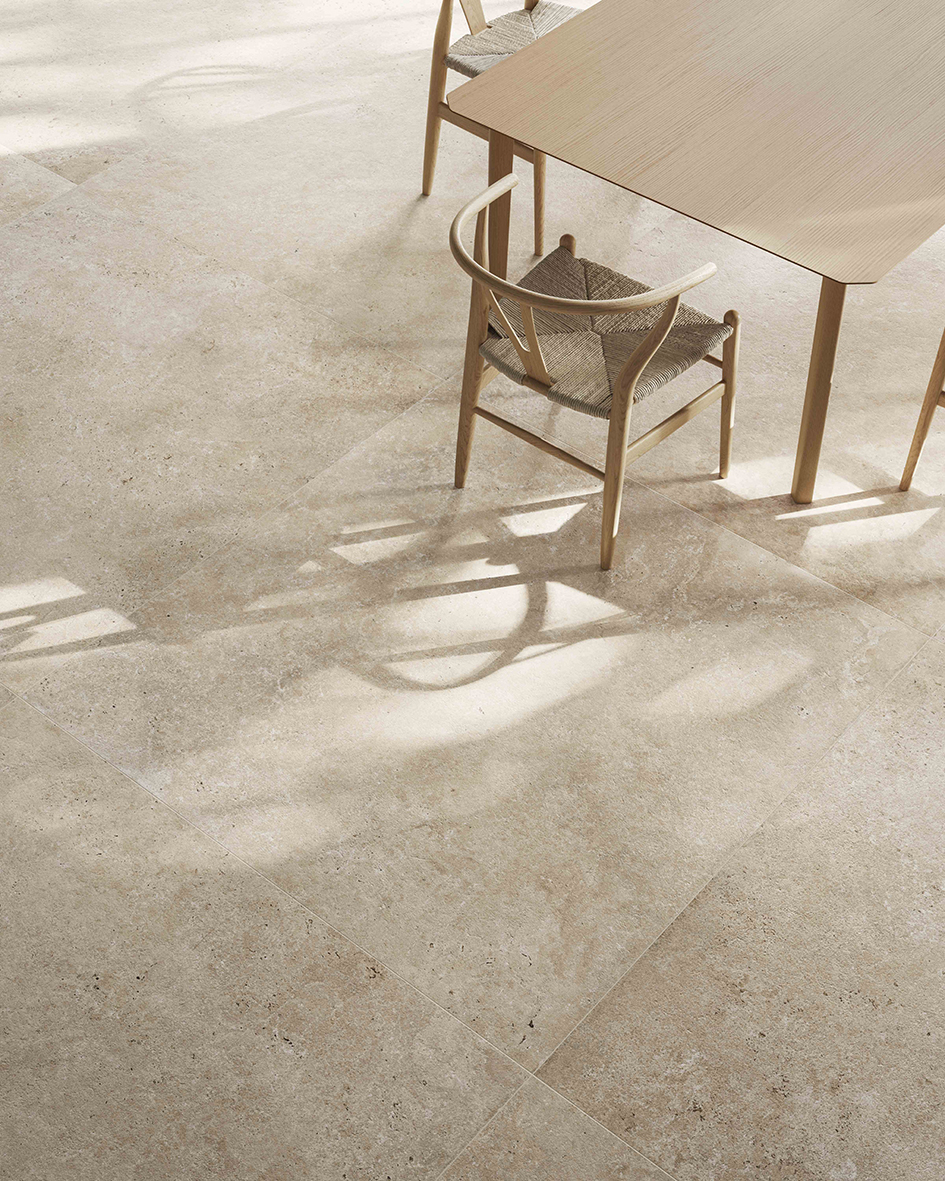 A beige porcelain stoneware tile inspired by the finest natural travertine and reinterpreted with modern taste, texture, and elegant appeal. Combining natural aesthetics with strength and practicality.