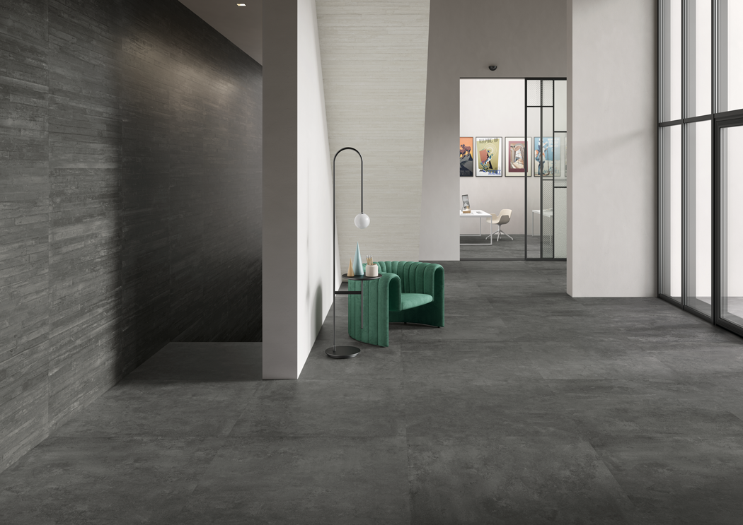 Inspired by industrial architecture; Re-Play Concrete Anthracite 3D interprets the strong and contemporary personality of concrete through striking textures, a charcoal colour in the trend-forward 3D format.