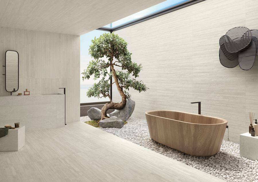 Inspired by industrial architecture; Re-Play Concrete White 3D interprets the strong and contemporary personality of concrete through striking textures, a white colour in the trend-forward 3D format.