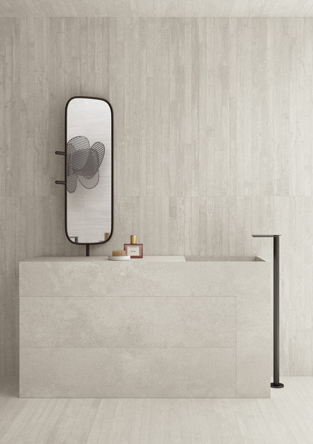 Re-Play Concrete Sand interprets the bold character of industrial concrete through a refined porcelain surface. Structured tones and subtle variation create depth and architectural clarity, while a versatile palette of six colours allows for cohesive or contrasting compositions. Designed to shape contemporary interiors with a confident, sophisticated edge.