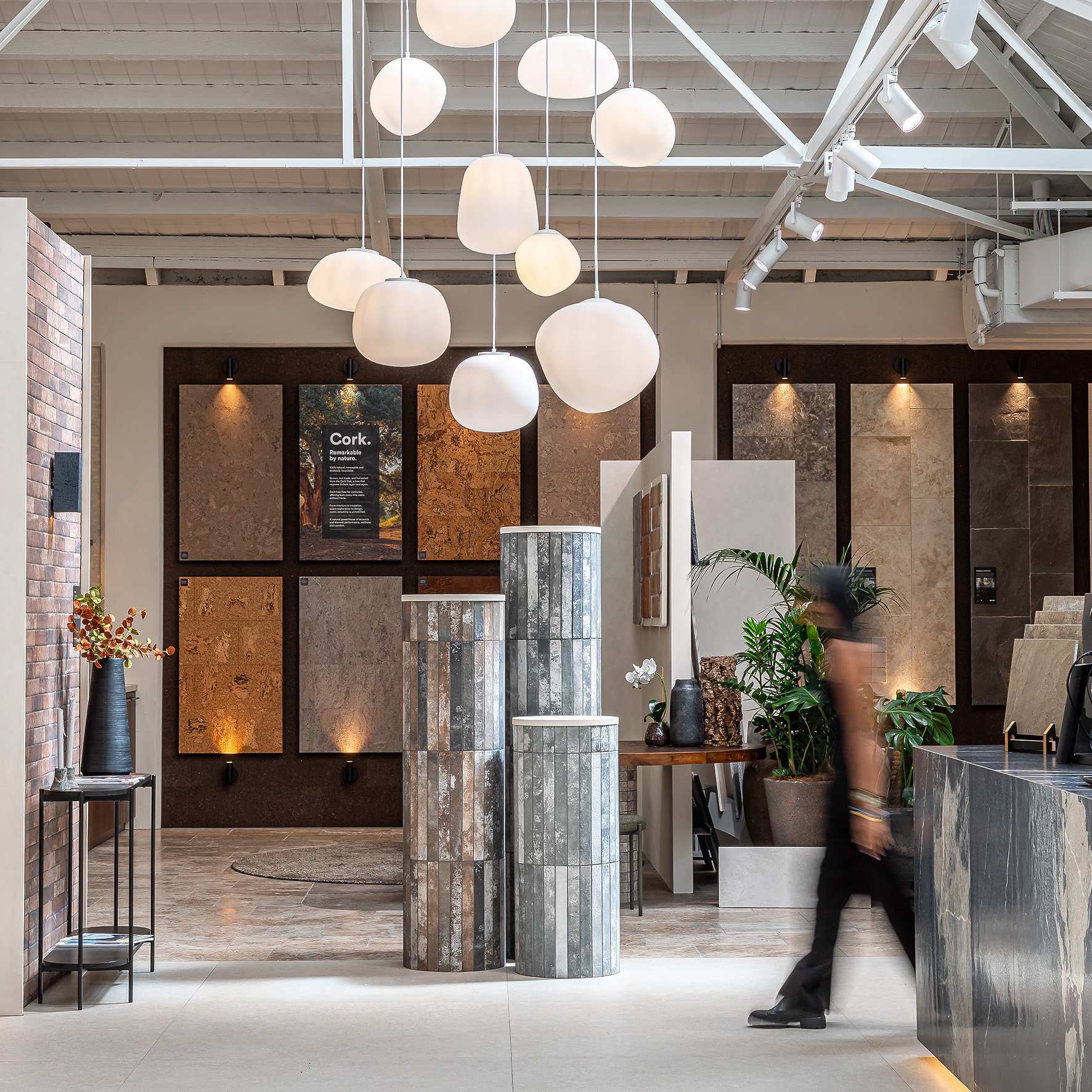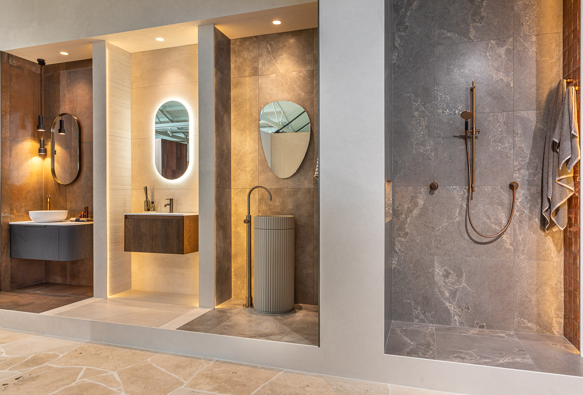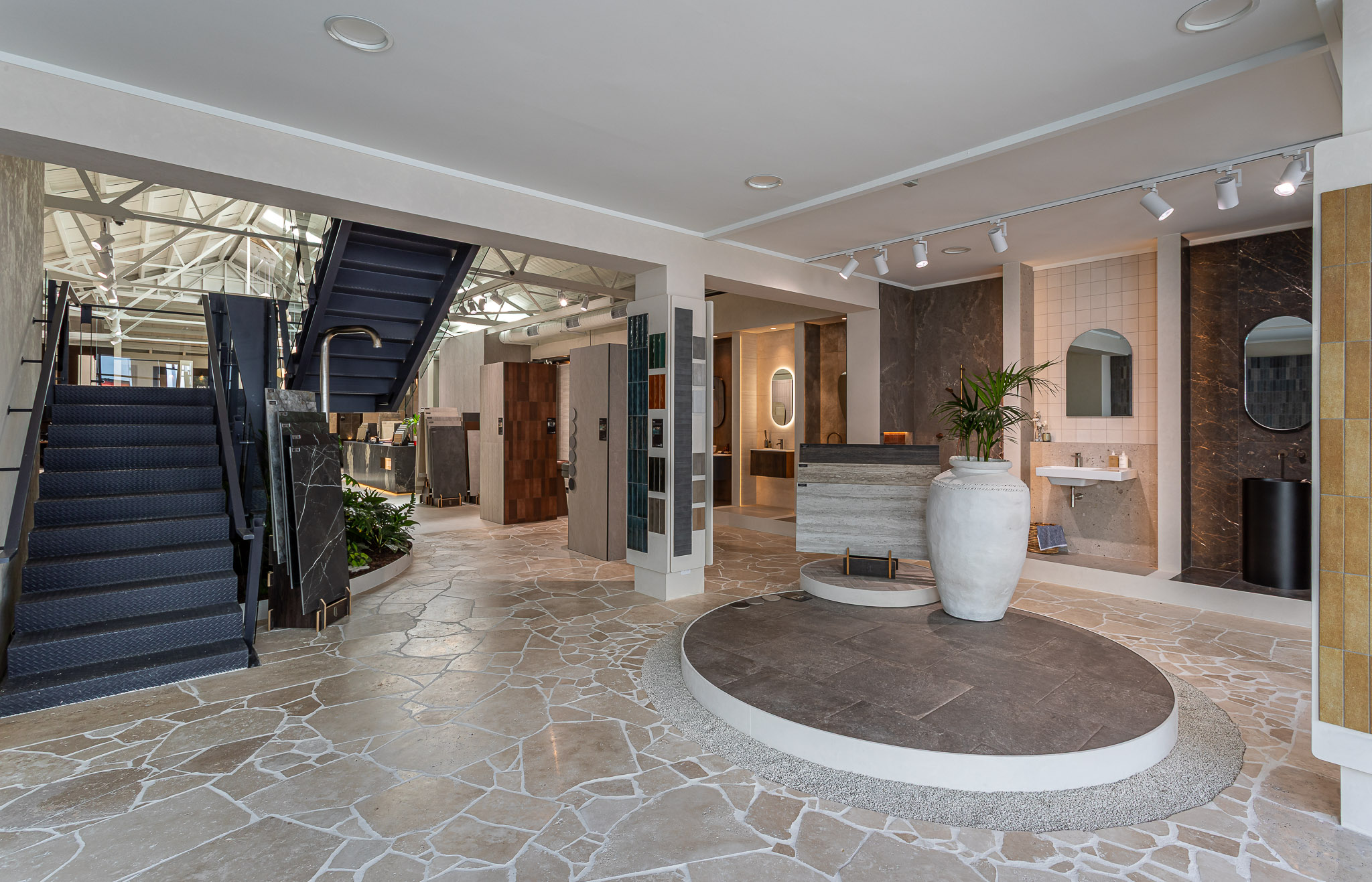 As you move through the showroom, materials shift in tone and application. Large-format stone sits alongside detailed tile work. Travertine paving connects interior and exterior zones. Moments of greenery soften the harder finishes and introduce contrast. Each area offers a different perspective, encouraging comparison and discovery.