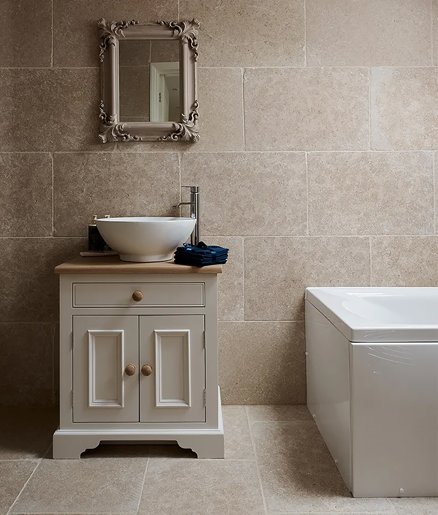 Biscoff Tumbled is a warm beige Limestone with a softly tumbled surface and edges. The lightly worn, old-world style and brings a sense of charm and allure to any floor or space. Mainly used throughout interiors, but some formats can offer a more textural element in exterior spaces such as the crazy paving or batons.
