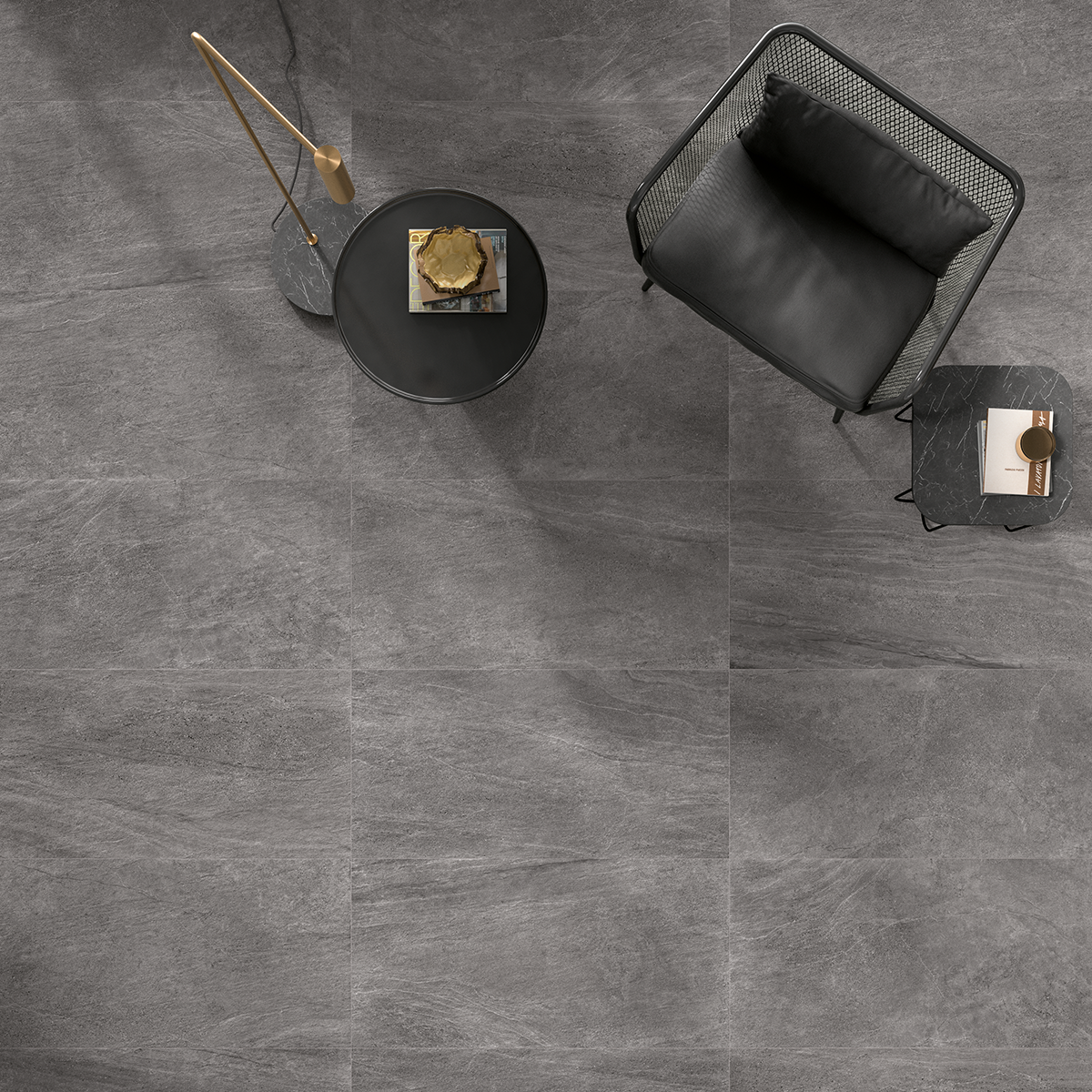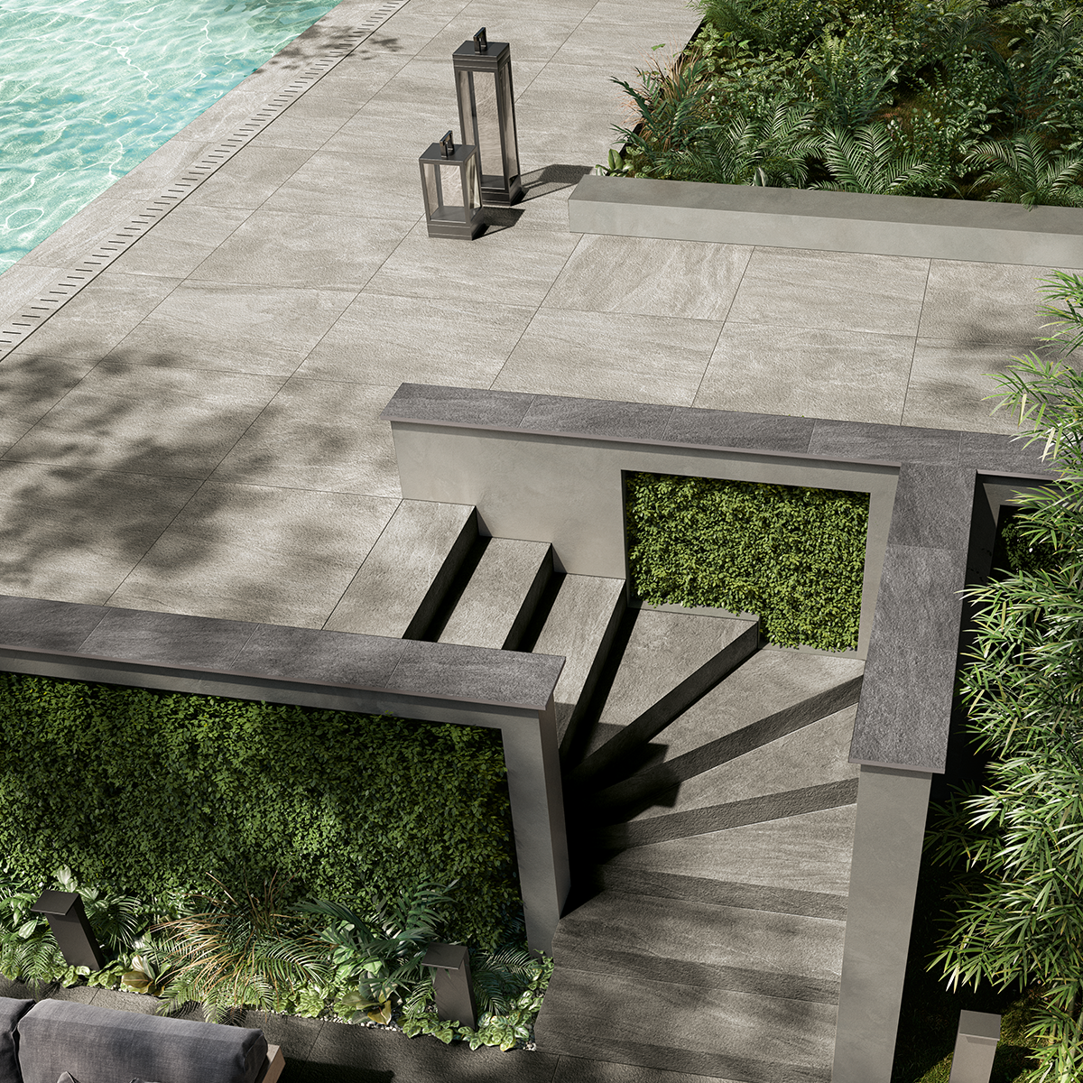 Subtle patterns and tactile elegance in a dark grey tone; Aspen Basalt is a unique stone-effect collection of porcelain stoneware to create easy indoor/outdoor flow.