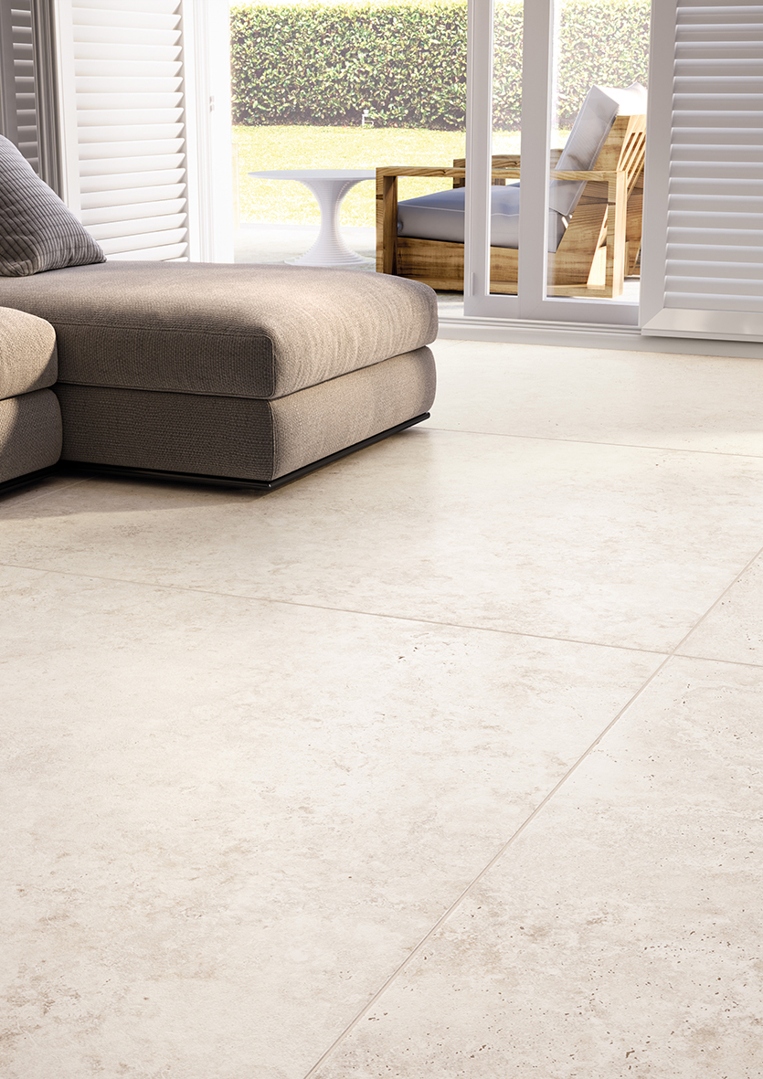 An ivory porcelain stoneware tile inspired by the finest natural travertine and reinterpreted with modern taste, texture, and elegant appeal. Combining natural aesthetics with strength and practicality.